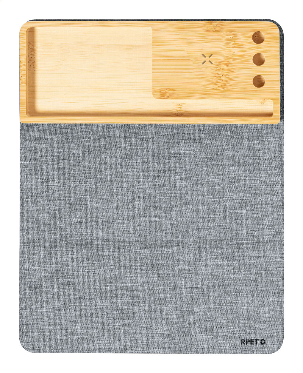 Foldable RPET polyester mousepad with silicone base. With built-in wireless fast charger (15W) and bamboo mobile phone holder. 300D RPET polyester. Including USB charger cable.