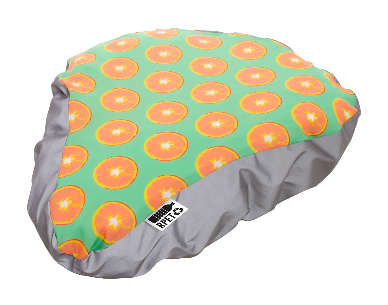 Custom made, full colour printed bicycle seat cover with reflective side and elastic band, 190T RPET polyester. With distinctive RPET label. Price includes sublimation printing. MOQ: 50 pcs. For promotional use only, the product does not qualify as a Personal Protective Equipment.