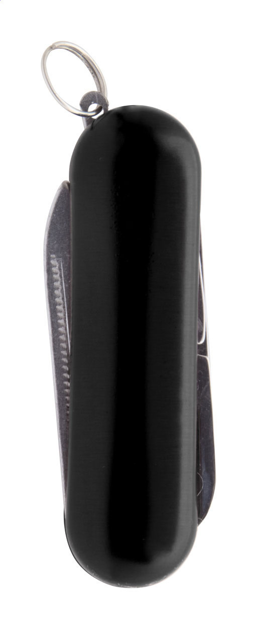 Mini, stainless steel pocket knife with 3 functions and aluminium handle.