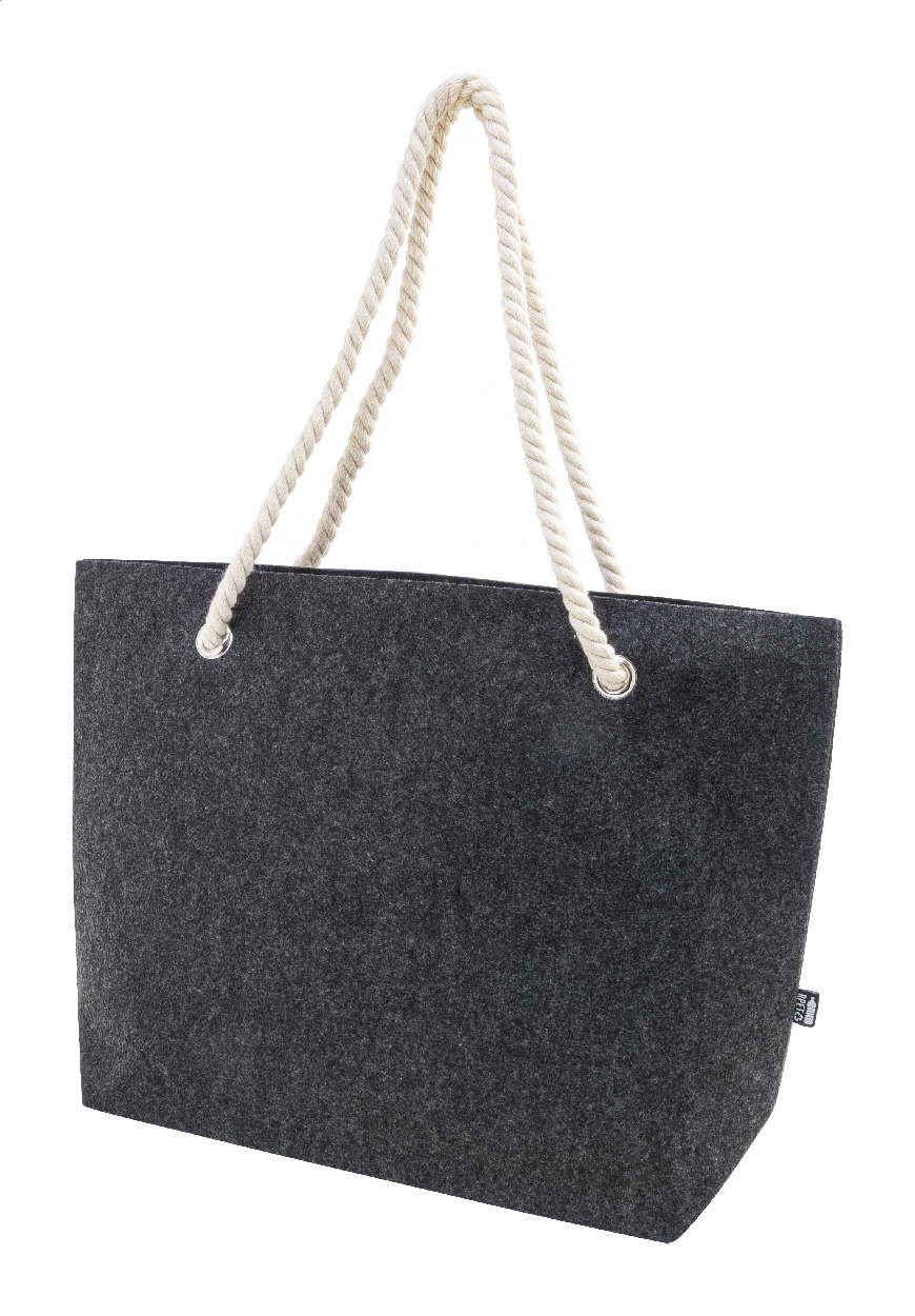 RPET felt beach or shopping bag with cotton cord handles and bottom gusset. With distinctive RPET label.